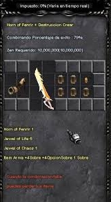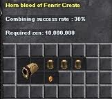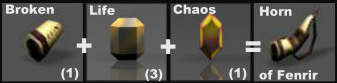 Usa la opción "Regular Combination". • 1 Horn of Fenrir • 5 Jewel of Life • 1 Jewel of Chaos
