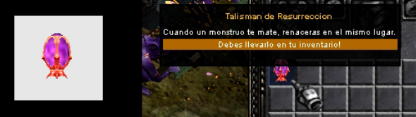 Éste talisman (TOR) te resucitará en la misma zona donde hayas muerto, siempre y cuando (quién te mató) haya sido un monstruo. Debes tenerlo en tu inventario al momento de morir.