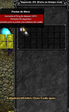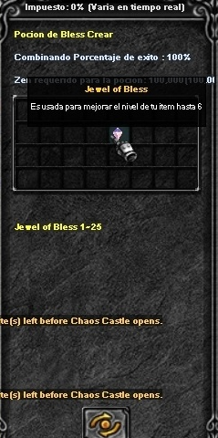 Las Pociones de Bless son especiales para el evento de Castle Siegue, ya que suben la fuerza y la posibilidad de golpe critico. Se crean colocando un "Jewel of Bless" en la maquina chaos