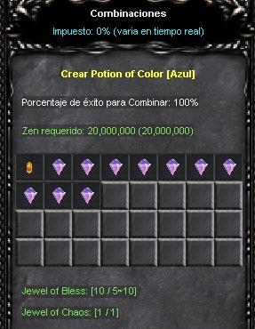 La combinación es muy sencilla. En el ejemplo mostraremos la combinación para la Potion of Color [Blue] a modo de ejemplo. El proceso es el mismo para las otras dos (respetando sus ingredientes correspondientes detallados anteriormente).