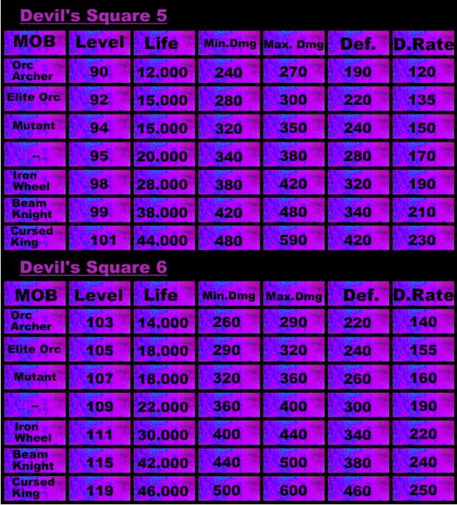 Reglamento del Devil Square: * La Invitación al Devil's Square sera eliminada de sus inventario cuando usted entre Devil's Square. * El Comando Warp puede ser usado después de entrar al Devil's Square. * No esta permitido entrar después de que los 15 espacios han sido llenados. * Cuando el personaje muera en el Devil's Square sera transportado a Noria. * El jugador que use un "Town portal scroll" en el Devil Square sera transportado a Noria. * No hay p?rdida de experiencia cuando un jugador no consigue matar en el Devil Square. * No hay perdida de Zen cuando un jugador muere en el Devil Square * Los artículos de los personajes no se caerán si en caso mueren. * PK no es Admitido en el Devil's Square. * Personajes que se queda en el Devil's Square después de la búsqueda serán retornados a Noria.