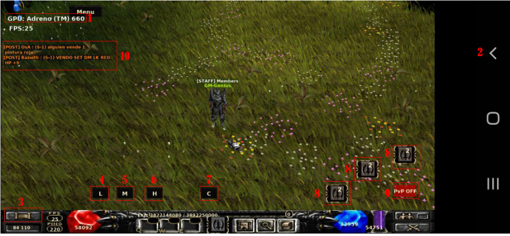 Lista de mensajes recibidos(Post,Whisp,Guild,Party)-> Deslizar hacia arriba o hacia abajo para explorar la lista de mensajes.