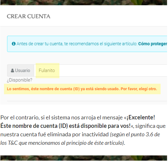 Por el contrario, si el sistema nos arroja el mensaje "¡Excelente! Éste nombre de cuenta (ID) está disponible para vos!", significa que nuestra cuenta fué eliminada por inactividad (según el punto 3.6 de los T&C que mencionamos al principio de éste artículo).