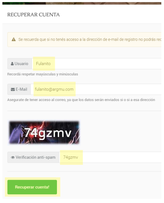Una vez que ya estamos en la sección para recuperar cuenta, los pasos a seguir son muy sencillos. Ingresamos el nombre de la cuenta que vamos a recuperar, la dirección de email con el cual registramos la cuenta y el código de seguridad anti-spam.