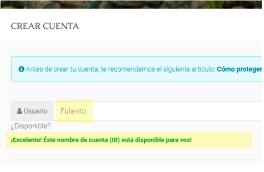 Ingresaremos, en el campo "Usuario", el nombre exacto de la cuenta que queremos recuperar (respetando MAYÚSCULAS/minúsculas según corresponda). Si el sistema nos arroja el mensaje "Lo sentimos, éste nombre de cuenta (ID) ya está siendo usado. Por favor, elegí otro." significará que la cuenta que estás intentando recuperar aún existe.