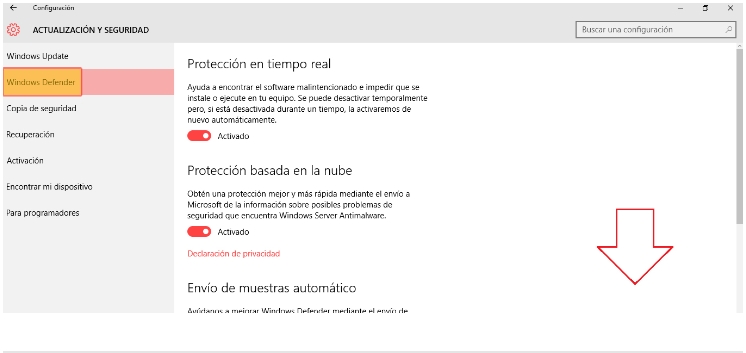 3er paso: click en Windows Defender ubicado en la lista de la izquierda, y luego baja con el scroll del mouse hasta la opción Exclusiones.
